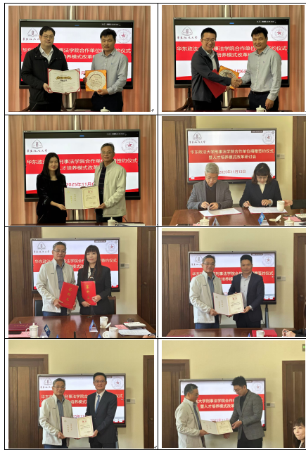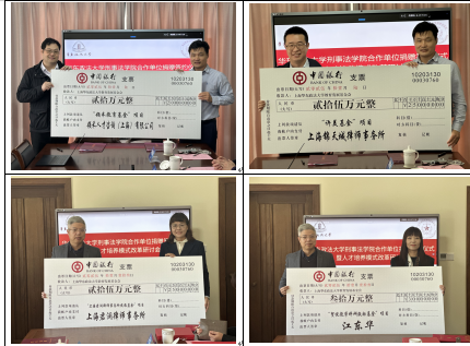 宋瑞和赖锦盛代表学校与四家捐赠单位(个人)签署《捐赠协议》,颁发捐赠证书和纪念品。孙万怀分别与四家合作单位签署《合作协议》,颁发刑事法学院兼职导师聘书。
