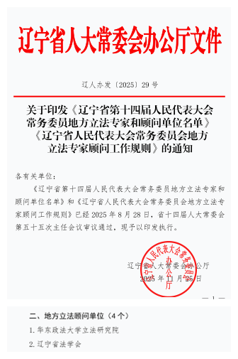 11月25日,辽宁省人大办公厅印发《<辽宁省第十四届人民代表大会常务委员地方立法专家和顾问单位名单><辽宁省人民代表大会常务委员会地方立法专家顾问工作规则>》的通知,我校立法研究院入选成为四家“辽宁省第十四届人民代表大会常务委员地方立法顾问单位”之一。