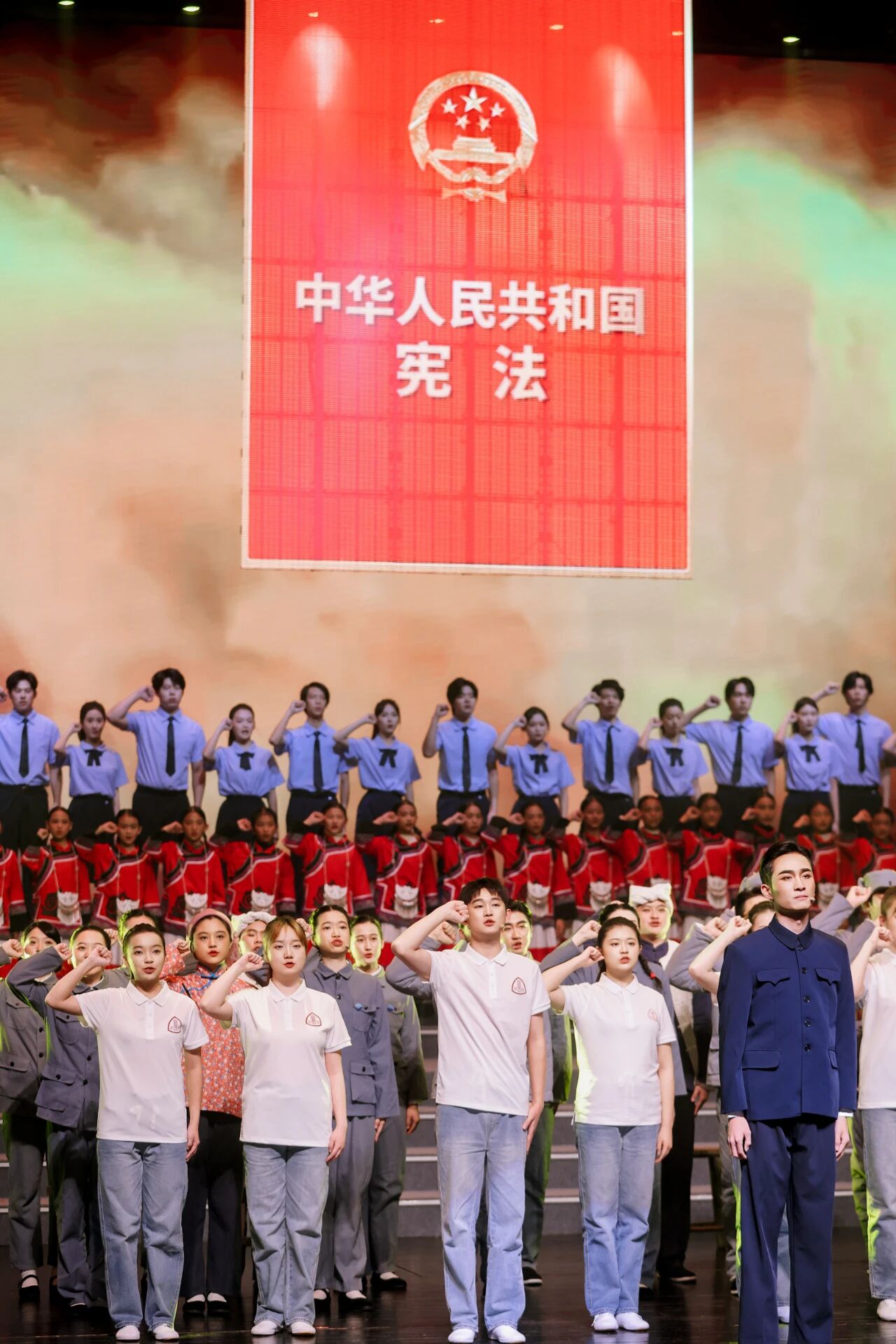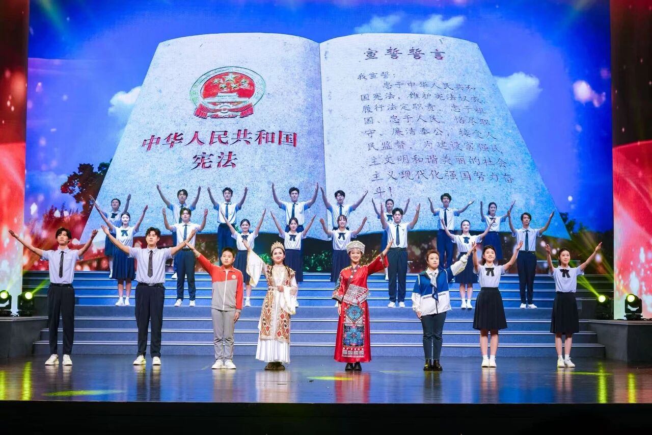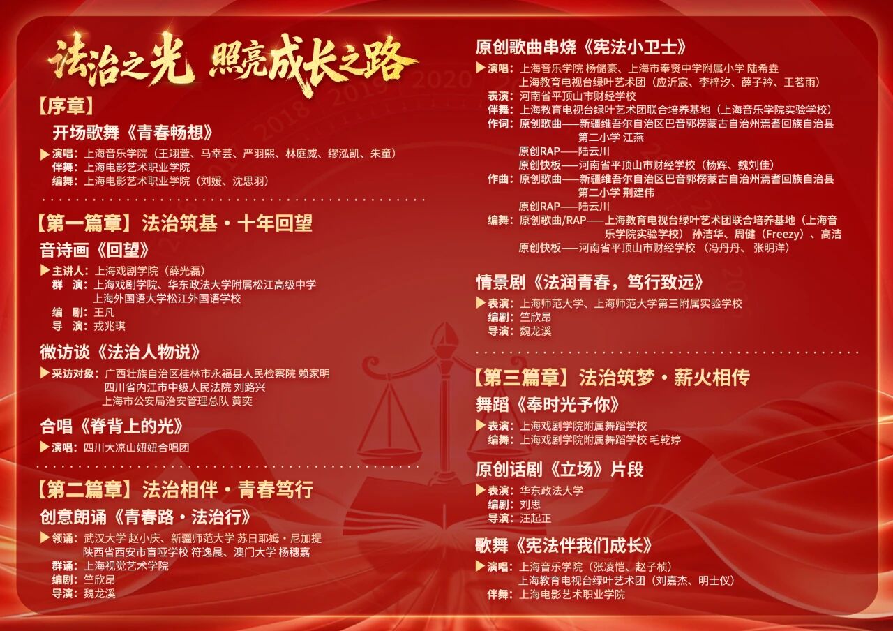晚会以“法治之光,照亮成长之路”为主题,设置“法治筑基·十年回望”“法治相伴·青春笃行”“法治筑梦·薪火相传”三个篇章,通过舞蹈、合唱、情景剧、话剧等多元艺术形式,生动回顾了十年来教育系统青少年学生法治教育的发展历程,集中展现了当代青少年尊法学法守法用法的良好精神风貌,为现场观众呈现了一场兼具思想性与艺术性的法治文化盛宴。