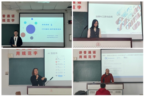 图书馆充分利用现有资源,深入开发本馆AI资源,为AI素养教育提供技术支持和工具基础,以师生需求为导向开展AI 技能拓展教育。图书馆信息素养系列培训分“常用数据库的应用”和“检索技能及科研技能”两个模块推进,其中“检索技能及科研技能”模块由图书馆学科馆员主讲,主讲教师同时承担校内文献检索课程教学工作,根据自身教学经验,开展针对性AI专题讲座,主题包括:法律AI应用入门探索、AIGC与信息素养融合、AIGC工具与论文写作、AI时代的法律文献检索等。