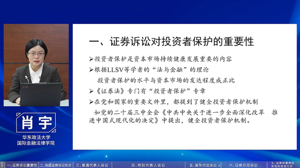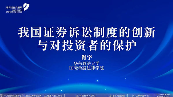 近日,国际金融法律学院肖宇教授主讲的“我国证券诉讼制度的创新与对投资者的保护”专题讲座在深圳证券交易所公众号“深交所互动易”发布,通过参与投资者教育工作,帮助投资者维护自身合法权益,促进我国证券市场高质量发展。