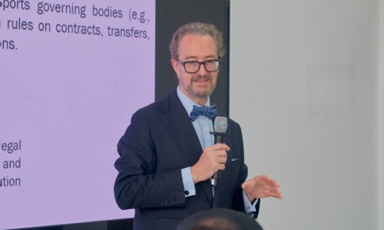 讲座以Introduction to Sports Law(体育法导论)为核心主题,胡安律师围绕国际体育法基本体系、全球体育治理结构、国际体育争议解决机制展开系统讲授,结合博斯曼案、韦伯斯特案、迪亚拉案、比利时塞兰俱乐部案等里程碑式经典判例,深度拆解国际体育规则适用逻辑与最新发展趋势,内容兼具前沿性、专业性与实务性。