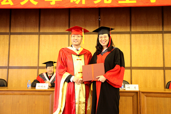 叶青为博士学位获得者颁发学位证书并同每位博士学位获得者亲切合影;校领导与导师代表为全体硕士学位获得者颁发硕士学位证书。