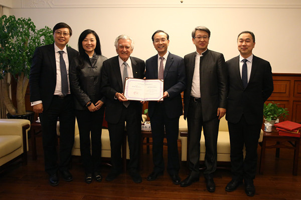 3月30日,澳大利亚前总理鲍勃·霍克先生在秘书左思华、豪力律师事务所中国事务部主任杨海荣先生的陪同下访问我校长宁校区。我校校长叶青、副校长刘晓红,律师学院常务副院长丁绍宽、特聘院长刘大力,国际交流处处长夏菲、副处长赖锦盛等参加了会谈和授予仪式。