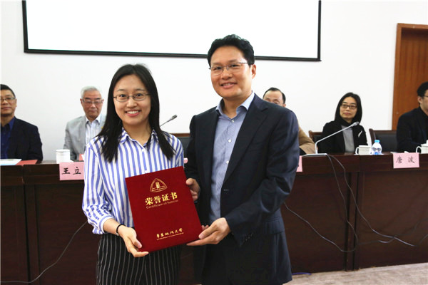 邹荣介绍了第三届“戈峻英才奖”的评审情况,宣读了获奖同学名单。王立民对戈峻校友的义举表示感谢,对获奖同学的综合素质给予了高度肯定。戈峻校友为每位获奖同学颁发了获奖证书。获奖同学代表施艺对戈峻和学校表达了感谢,表示“戈峻英才奖”已成为在校学生奋发图强的精神力量源泉,他们将不忘感恩、不忘回馈母校、不忘以汗水和勤勉回馈关心爱护他们成长的人。随后,获奖同学分别以PPT和演讲的形式作了学习、科研、实践等方面的风采展示。