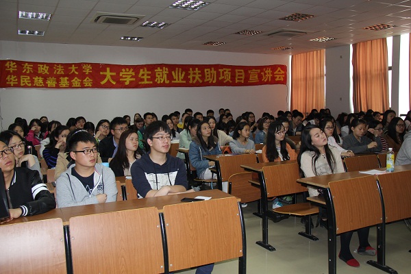 4月13日下午,2016年大学生就业扶助项目宣讲会在明法楼顺利举行。本次宣讲会由学生处与华民慈善基金会主办,近200名2013级学生参加。