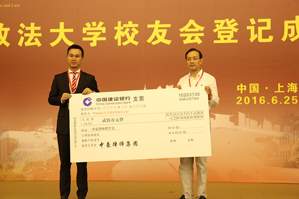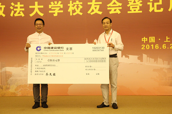 在随后举行的捐赠仪式及优秀校友工作者表彰大会上,校党委副书记、基金会副理事长应培礼宣读已设立的捐赠项目,中豪律师集团、锦天城律所和校友虞伟庆、乔文骏、朱颖、俞思瑛、李钰君、盛雷鸣、李向农、俞锋,教师丁建顺,华政湖南校友会和厦门校友会等单位和个人共捐赠1664万元教育发展基金及珍贵文物和版权。校友俞理伟、虞伟庆作为捐赠代表,陈慧谷作为优秀校友工作者代表发言,表达了对学校的感恩和祝福之情。