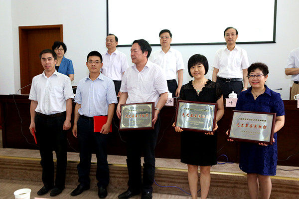 校党委书记曹文泽、校长叶青、校党委副书记应培礼、副校长顾功耘和林燕萍分别为我校获评市教卫工作党委系统先进基层党组织、优秀共产党员和优秀党务工作者获得者、校2016年度先进基层党组织、优秀共产党员和优秀党务工作者获得者和“践行‘四讲四有’•做合格党员”主题征文活动组织奖获奖单位颁发证书和奖牌。