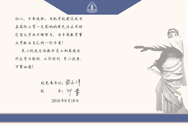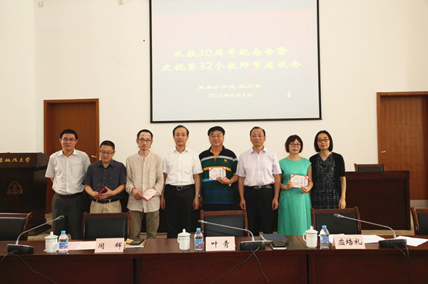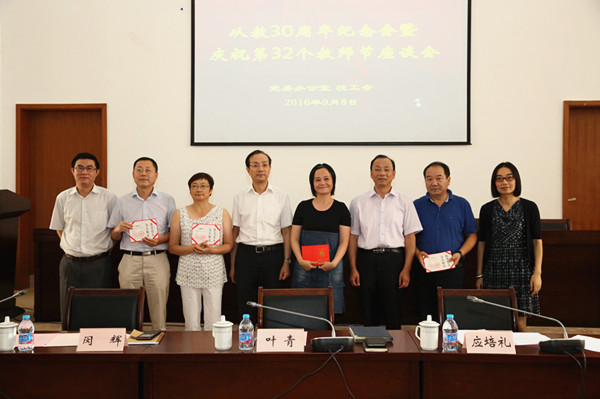 时值第32个教师节来临之际,学校党政班子致信全体教职员工、离退休老同志,送上节日的祝愿。9月8日,我校举行庆祝教师节暨“从教30周年”座谈会,校长叶青,校党委副书记、副校长闵辉,副校长唐波,党委委员、工会常务副主席郑列和2015——2016年校级以上奖项获奖教师代表、从教30周年教师代表、部分职能部门负责同志、2016年新进教师代表等参加座谈会。座谈会由校党委副书记、工会主席应培礼主持。