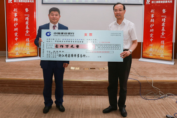 徐宗新以浙江靖霖律师事务所的名义向母校捐赠100万元用于设立“靖霖基金”。其中,80万元用于设立“律师学院刑事辩护研究中心”,20万元用于设立“靖霖奖教奖学金”。邹荣代表教育发展基金会与徐宗新签署“靖霖基金”捐赠协议。叶青代表学校接受捐赠,并与徐宗新共同为刑事辩护研究中心揭牌。