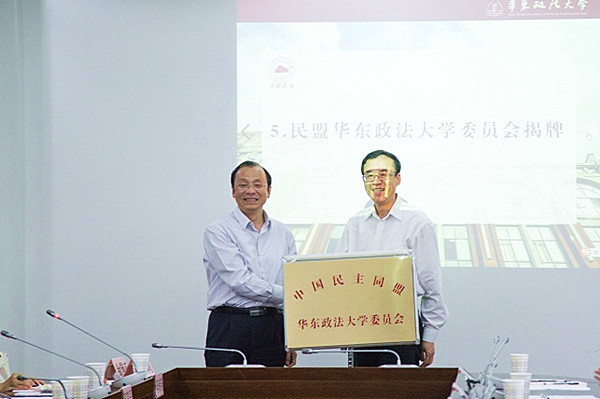 王伟国宣读了盟市委关于《民盟华东政法大学总支升格的批复》和《民盟华东政法大学委员会的换届批复》。沈志刚和应培礼共同为民盟华政委员会揭牌。民建华政委员会副主委王莲峰代表兄弟党派致贺词。