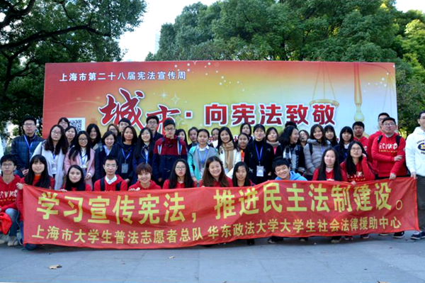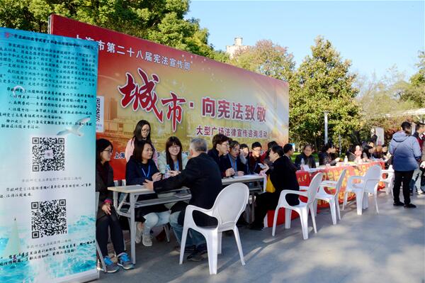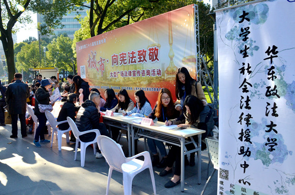 为迎接上海市第28届宪法宣传周的到来,12月3日上午,由我校大学生社会法律援助中心志愿者和华东师范大学志愿者组成的上海市大学生普法志愿者总队在中山公园举办宪法日大型普法活动。此次普法活动以“城市·向宪法致敬”为主题,由志愿者们为市民提供现场法律咨询,普及宪法和法律知识。