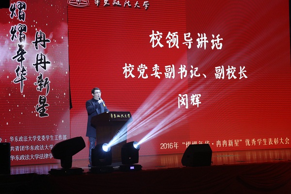 12月14日下午,我校隆重举行2016年度优秀学生表彰会。此次表彰会以“熠熠年华•冉冉新星”为主题,集中表彰我校2016年度获得各类先进荣誉称号和奖助学金的学生个人和集体。校党委副书记、副校长闵辉出席并讲话,党委组织部、党委宣传部、档案馆、党委学工部(处)、校团委等职能部门和各学院负责人到会并担任颁奖嘉宾。