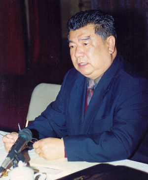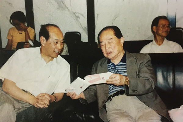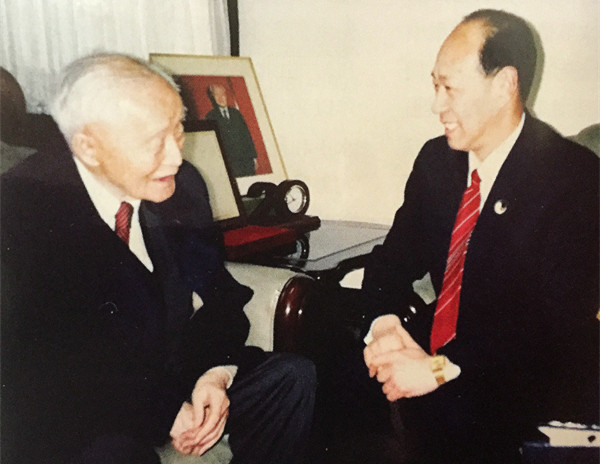 陈鹏生教授(左)与原海协会会长汪道涵交谈台湾问题