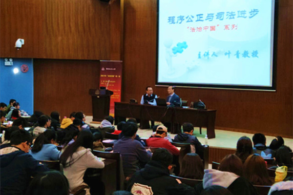 3月23日上午,校长叶青教授在明珠楼一楼报告厅为我校本科生主讲2017年“法治中国”课程第一讲。本讲主题为“程序公正与司法进步”,由马克思主义学院副院长赵庆寺教授主持。