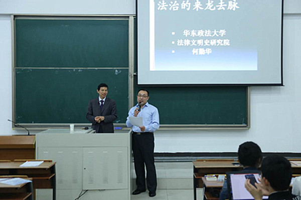 4月26日晚,我校法律学院博士生导师何勤华教授在集英楼为我校部分本科生主讲2017年“法治中国”课程第三讲。本次课程的主题为“法治的来龙去脉”,由马克思主义学院副院长赵庆寺教授主持。