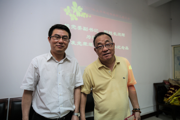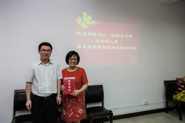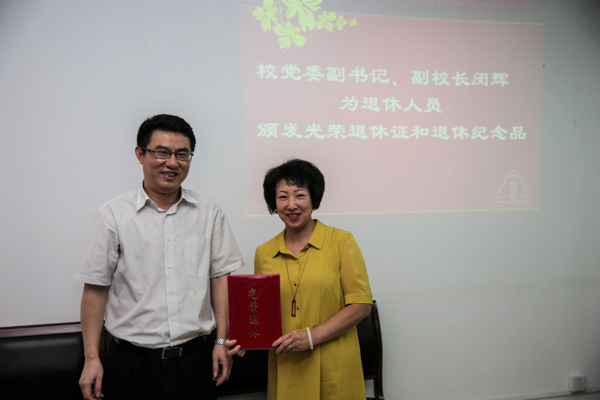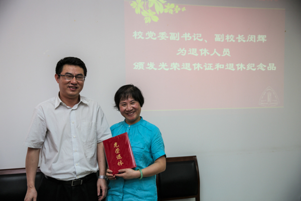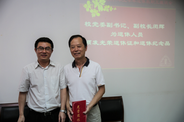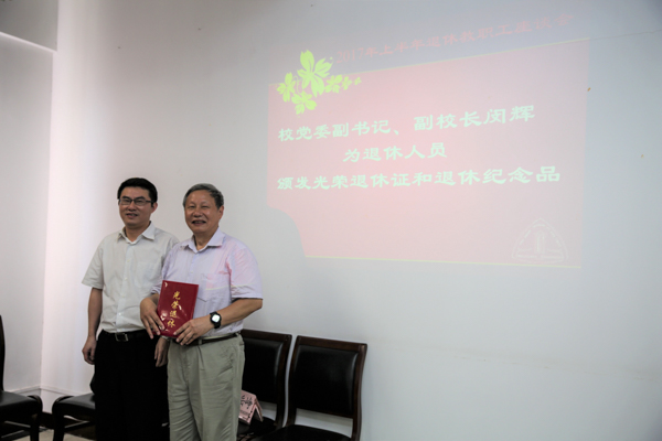 闵辉向与会退休教职工颁发光荣退休证,赠送了专门制作的纪念品,并一一握手言谢。