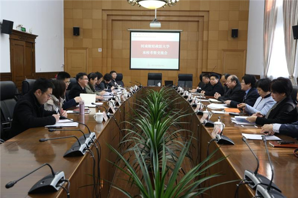 12月19日上午,河南财经政法大学党委书记杨宏志、党委副书记华小鹏、纪委书记师维等一行八人来校调研座谈。我校党委副书记、副校长闵辉,副校长顾功耘和相关部门负责人出席座谈会。