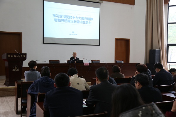 3月15日下午,北京师范大学思想政治工作研究院院长、博士生导师冯刚教授应邀来校作“学习贯彻党的十九大精神,增强思想政治教育发展的内生动力”专题讲座。各学院分管学生工作党委(党总支)书记、副书记,全体专兼职辅导员和学工部(处)工作人员参加。