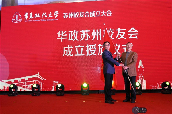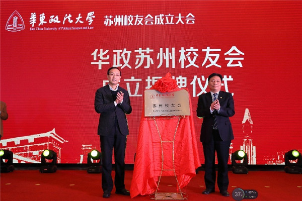 叶青、应培礼、何丹、韩冰、陈慧谷共同启动华政苏州校友联谊会成立按钮,叶青和何丹为华东政法大学苏州校友联谊会揭牌,应培礼向韩冰授旗。会上为华政苏州校友联谊会会长、副会长、常务理事及理事颁发了聘书。