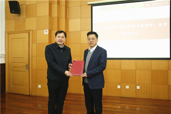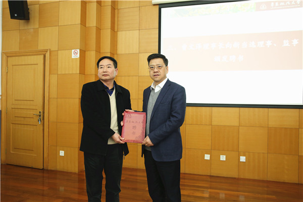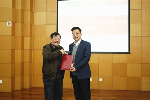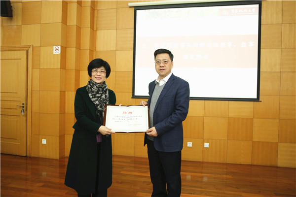 邹荣对理事会成员的调整情况作了相关说明。根据职务行为和自然更替基本原则,增补副校长陈晶莹、张明军、周立志为理事并担任副理事长,顾功耘、林燕萍不再担任理事和副理事长,石毅校友由理事转任监事。曹文泽理事长向历任理事表示衷心感谢,向新当选理事、监事表示祝贺并颁发聘书。