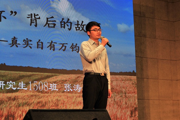 第十五届“挑战杯”全国决赛特等奖获奖代表张涛同学分享了团队参加“挑战杯”的旅途,他们以真实的话语、真实的故事、真实的选题、真实的调研以及真实的思考,努力践行着校训精神。