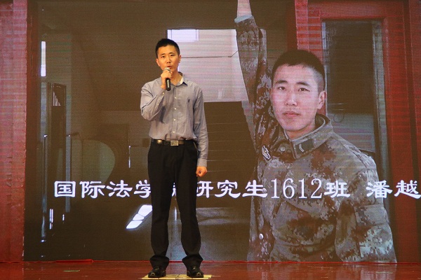 校青年五四奖章获得者潘越同学分享了从入伍到考研的经历,及在华政长宁校区救助落水老人的事迹,表达想为国家作贡献、促进法治社会的决心。