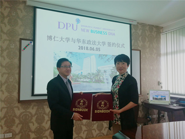 在博仁大学(Dhurakij Pundit University),我校代表团一行受到博仁大学副校长Woraphong Dechasasawat、中国-东盟国际学院院长Dr.Kelvin C.K.Lam、副院长Chennicha的热情欢迎。Woraphong Dechasasawat向我校代表团介绍了博仁大学概况,特别提到该校于2015年6月24日在博仁大学成立的全球首家海上丝绸之路(海上丝路)孔子学院,期待借此平台进一步深化两校合作。夏菲介绍了我校最新发展情况,并指出我校近期国际化发展的一项重要内容就是加强与泰国在内的“一带一路”沿线国家全方位的合作。范玉吉介绍了传播学院的发展情况,提出了从师资、学生交换到科研合作的计划。夏菲向对方转交了陈晶莹副校长签署的两校合作备忘录。Woraphong Dechasasawat现场进行签署,两校正式建立合作关系。Woraphong Dechasasawat还与范玉吉共同签署了博仁大学中国-东盟国际学院与华东政法大学传播学院的合作备忘录,并就具体合作计划进行了深入探讨。