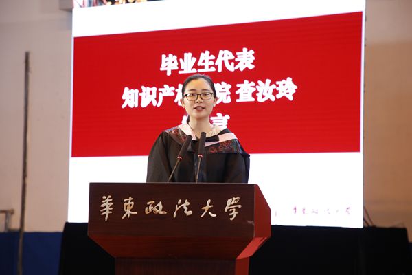 知识产权学院查汝玲同学代表毕业生发言。她以“感恩”“收获”“展望”三个关键词,分享了自己大学四年的学习成长感悟,并表示,全体毕业生将牢记母校嘱托,严于守法,匡扶正义,不畏艰险,迎风远航。