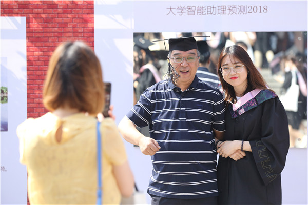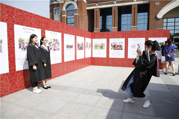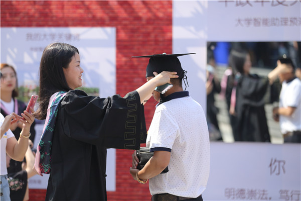 张明军、周立志代表学校接受毕业生赠送的“我的大学关键词”纪念卷轴,并回赠了学校统一为毕业生定制的个性化纪念品。