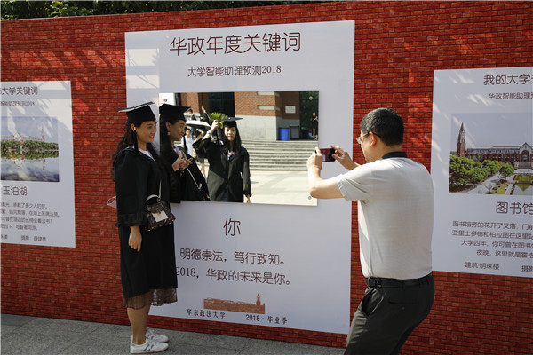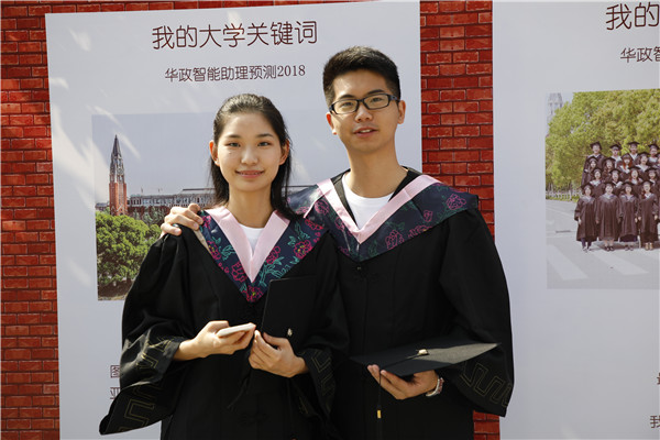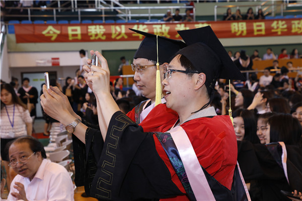 典礼开始前,与会人员观看了华政宣传片,毕业歌曲《那些年的小幸运》《华政教会我的事》及华政青年网络电视台毕业视频《不再见·2018我们毕业啦!》。毕业生们争相在“我的大学关键词”展板前拍照留念,学校还特别开通了网络直播平台,通过校园网、微信平台直播毕业典礼,让未能亲临现场的毕业生、家长、校友和社会各界人士第一时间分享同学们的激动与喜悦。特别开辟出微信墙,让师生、校友、家长“上墙”抒发毕业感言,互赠真挚祝福。