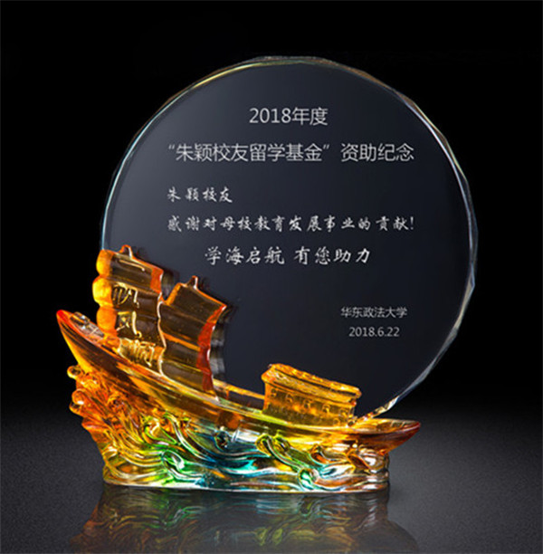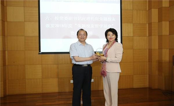 应培礼向朱颖校友颁发了“朱颖校友留学基金”资助纪念牌,代表学校感谢朱颖校友为母校教育事业发展所作的贡献。