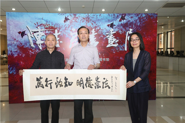 陈志宏先生在讲话中表示,能在华东政法大学举办个人书画展,并为广大师生传播中国传统文化,深感荣幸。仪式上,陈先生还向我校赠送了校训书法作品“笃行致知,明德崇法”,并现场泼墨挥毫,为图书馆题赠“开卷有益”。师生们驻足流连于作品前,轻品慢赏,意味无穷。
