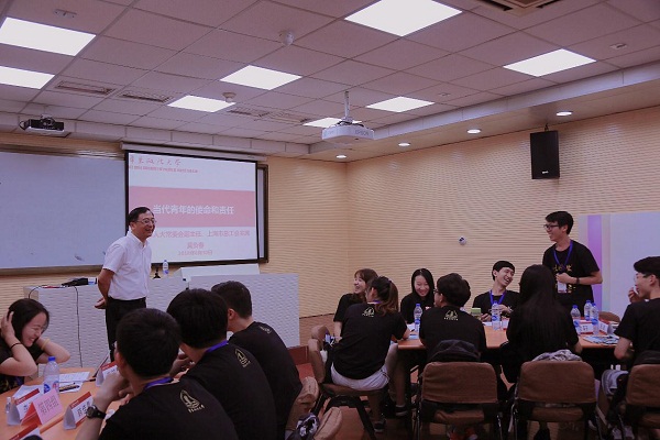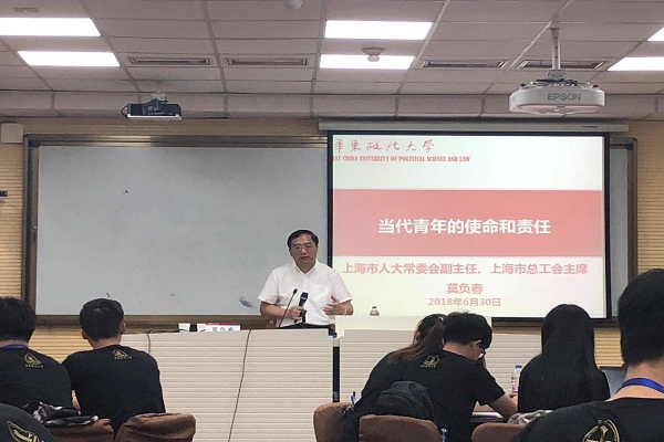 6月30日上午,上海市人大常委会副主任、上海市总工会主席、我校杰出校友莫负春应邀为我校第三期大学生骨干领导力训练营学员作首场讲座。讲座题为“当代青年的使命和责任”,由学工部(处)部(处)长王戎主持。