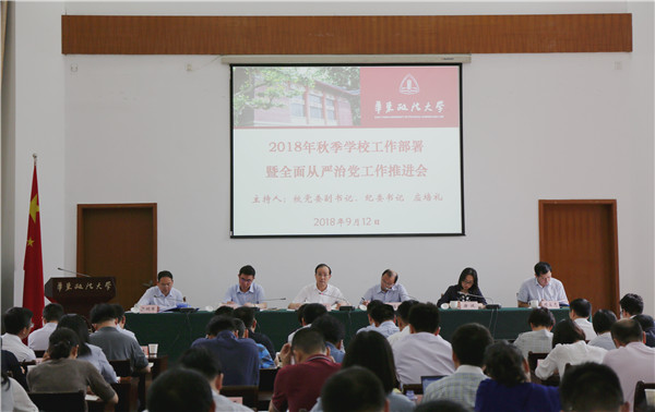 为全面、深入传达上级相关重要会议和文件精神,进一步深化落实学校各项事业发展战略,确保下半年我校全面从严治党和各项党政重点工作有序推进与高效落实,9月12日,我校召开2018年秋季学校工作部署暨全面从严治党工作推进会。校党委副书记、校长叶青,校党委副书记、副校长闵辉,党委副书记唐波,副校长张明军、周立志以及校党委委员、纪委委员、工会委员会委员和全体中层干部参加会议。校党委副书记、纪委书记应培礼主持会议。