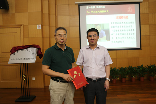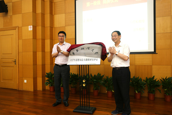 闵辉宣读了《关于成立华东政法大学大学生思想动态大数据研究中心的通知》,教育部高校思想政治理论课教学指导委员会副主任高德毅教授与闵辉共同为研究中心揭牌。