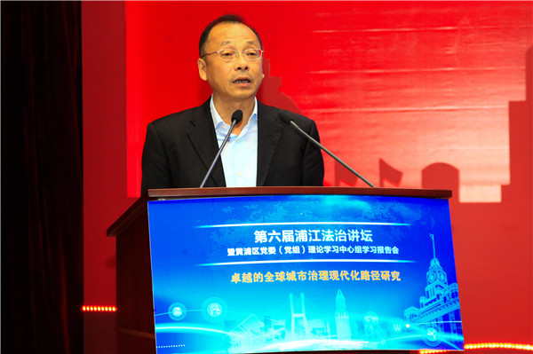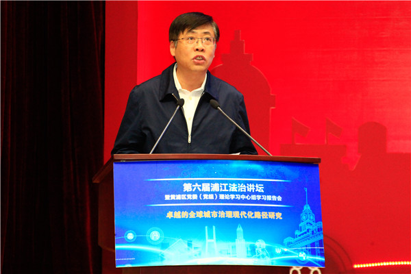 10月16日下午,由我校共同主办的2018年第六届浦江法治讲坛暨黄浦区党委(党组)理论学习中心组学习报告会在沪举行。本届讲坛的主题是“卓越的全球城市治理现代化的路径研究”。中共黄浦区委书记、区依法治区领导小组组长杲云,上海市司法局党委副书记、政治部主任刘卫萍,我校党委副书记、纪委书记应培礼致辞。