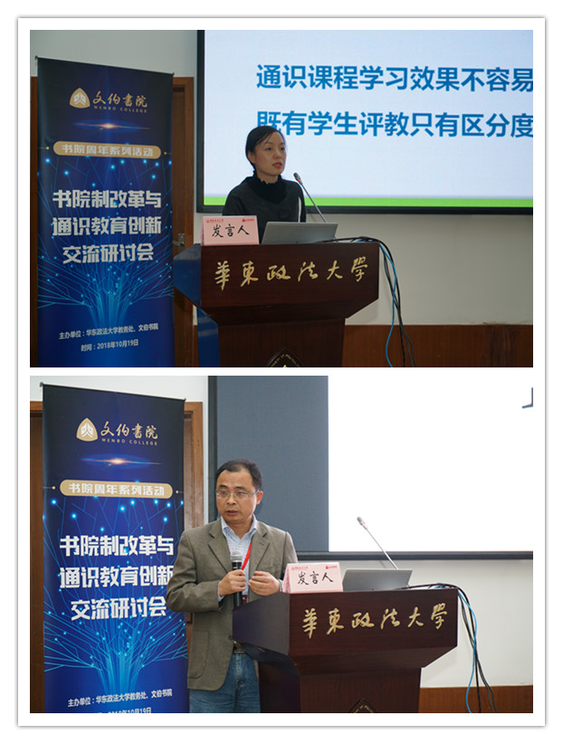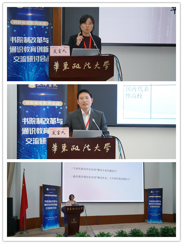 南京审计大学泽园书院党委副书记刘海燕、上海政法学院副教授刘英明、文伯书院通识教育中心主任杜素娟围绕“通识教育与专业教育的衔接与融通”主题展开汇报。刘海燕从“为什么通识教育和专业教育难融合”“为什么在中国大学推行通识教育面临这么多困境”问题导向出发,就如何切实从我们中国教育体制模式下促进通识教育和专业教育融合提出了思路。刘英明从考虑院系重组、建设核心通识课程、结合院校实际情况、重视住宿学院式通识教育四个角度对“通识教育与专业教育的衔接与融通”提出了建议。杜素娟结合教学体会和经验,从如何解答实践中学生对于开展通识教育的困惑出发,就通识教育对人格教育和能力教育的实践意义进行了阐释。