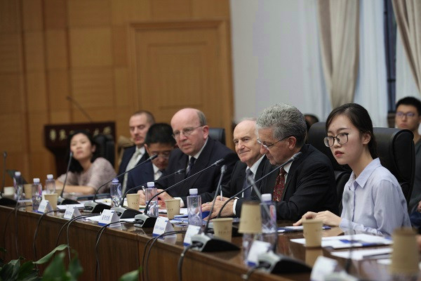 10月26日,英国最高法院大法官霍奇勋爵(Lord Hodge),英格兰和威尔士高等法院法官罗宾·诺尔斯爵士(Mr Justice Sir Robin Knowles),前英格兰和威尔士高等法院法官、我校客座教授威廉·布莱尔爵士(Sir William Blair)等英国法官代表访问我校。最高人民法院国际合作局副局长陆效龙、上海市高级人民法院副院长盛勇强等最高人民法院和上海市高级人民法院的代表陪同访问。