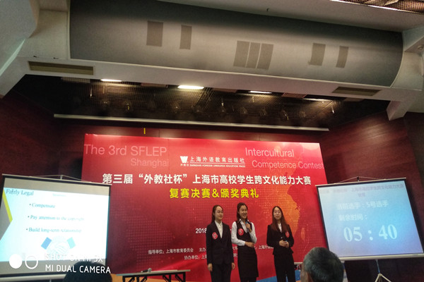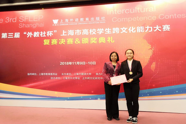 11月9日至10日,第三届“外教社杯”上海市高校学生跨文化能力大赛在上海外语教育出版社举行,来自上海27所院校的学生以三人为一组进行案例展析、接受评委提问、回答开放式问题。经过外语学院王海萍、伍巧芳、林大江、甘翠平等老师多日来的悉心指导,面对各大高校激烈的竞争,代表我校参赛的英语专业1666班杨嘉欣、1640班陈婕凡以及翻译专业1642班吴雅彬在案例展示环节结合英语与法律相关知识,凭借出色的表现力与流利的口语能力震撼全场,以85.86分的总成绩获得三等奖。