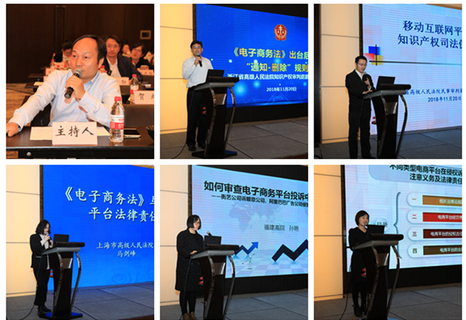 “平台经济视角下的网络知识产权司法保护”由江苏省高级人民法院知识产权审判庭副庭长汤茂仁主持,中山大学法院学院博士生导师李扬教授、河南省高级人民法院知识产权审判庭副庭长宋旺兴担任点评人,浙江省高级人民法院知识产权审判庭庭长蒋中东、湖北省高级人民法院知识产权审判庭副庭长童海超、上海市高级人民法院知识产权审判庭审判长马剑峰、福建省高级人民法院知识产权审判庭审判员孙艳、南京知识产权法庭审判员于佳虹分别作了“《电子商务法》出台后的‘通知-删除’规则”“移动互联网平台中的知识产权司法保护问题”“《电子商务法》与电商平台法律责任”“如何审查电子商务平台投诉中的‘通知’”“不同类型电商平台在侵权诉讼中的注意义务及法律责任”五项主题发言。
