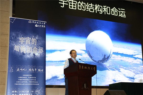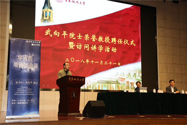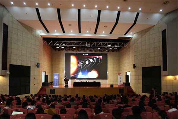 随后,武向平院士以“宇宙的结构和命运”为题,从宇宙“往古来今谓之宙,四方上下谓之宇”的命名、空间大小、质量多少谈起,用通俗易懂的阐释方法和形象生动的图片类比,围绕宇宙的“过去、现在、将来”主线,向与会师生展示了一个富有行星、恒星、黑洞、暗物质、暗能量的生动宇宙。“我们只能看到宇宙的过去,而不能看到宇宙的现在和未来”的科学阐释,“肉眼观测的可见部分不是宇宙的全部”的逻辑论证,“世界各国共同探索宇宙未知”的项目实例都让与会师生真切感受了宇宙的无限浩瀚、无限未知和人类的无限渺小和无限可能。人类探寻宇宙智慧生命的方式方法、地球命运的未来,宇宙对人对未来的影响、黑洞观测的最新情况、宇宙的诞生和膨胀论都引发了与会师生的强烈反响和热烈讨论。与会师生纷纷表示,武院士深入浅出、生动幽默的学术讲座让人耳目一新,让自身对于数十年如一日的研究意志和实事求是的科学精神有了更直面、深刻的理解,对丰富自身知识架构、拓展学术视野有着重要的指引价值。
