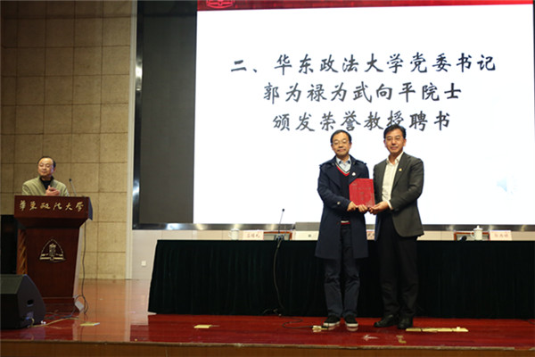 荣誉教授聘任仪式在松江校区缘法厅举行。郭为禄代表学校向武向平院士颁发荣誉教授聘书,授聘仪式及学术讲座由应培礼主持。