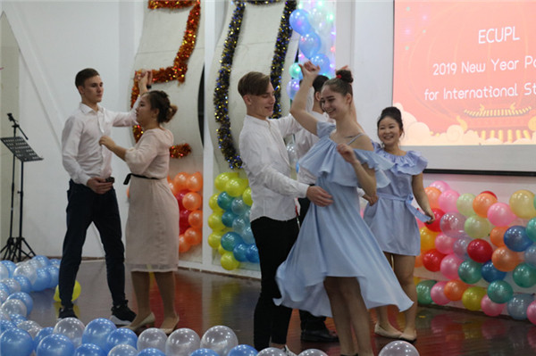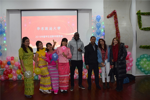 12月21日,国际交流处(国际文化交流学院)主办的留学生迎新年联欢会在松江校区团学活动中心举行。国际交流处处长、国际文化交流学院院长夏菲,资产管理处处长孙帅梅,国际交流处副处长赖锦盛、马乐,教务处副处长尹天松,法律学院党委副书记李家华,国际法学院党委副书记侯玉芹,知识产权学院党委副书记刘光龙等与部分外籍教师、学院辅导员、国际交流处(国际文化交流学院)工作人员,以及来自俄罗斯、韩国、哈萨克斯坦、坦桑尼亚、马里、意大利、缅甸、法国等30多个国家近120名留学生齐聚一堂、共贺新年。