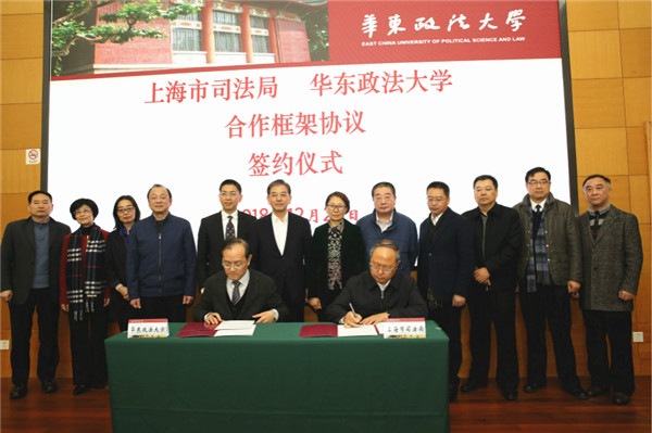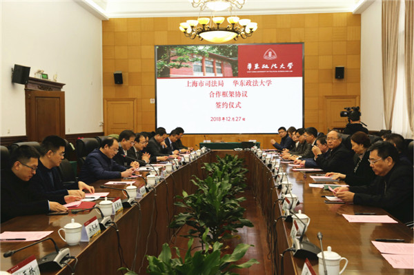 2018年12月27日,我校与上海市司法局在长宁校区签署合作框架协议。上海市司法局党委书记、局长陆卫东,我校党委书记郭为禄出席会议并讲话,校党委副书记、校长叶青致欢迎词,党委副书记应培礼主持签约仪式。