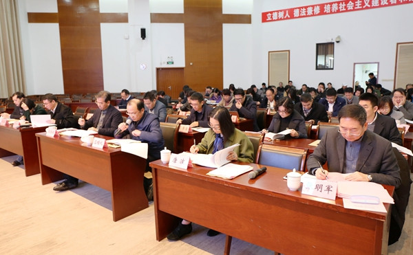 为深入学习贯彻习近平新时代中国特色社会主义思想和党的十九大精神,提升基层党组织书记全面从严治党第一责任人的主责主业意识和履职尽责能力,促进基层党的建设全面进步、全面过硬,1月9日上午,我校召开2018年度基层党组织书记落实意识形态工作、基层党建工作、党风廉政建设和党内监督工作“三大主体责任”述职评议会。校党委书记郭为禄,校党委副书记、副校长闵辉,校党委副书记唐波,副校长陈晶莹,校党委常委、副校长张明军、周立志,以及校党委委员、纪委委员、民主党派和统战团体负责人、二级单位党政负责人、党员群众代表参加会议。会议由校党委副书记、纪委书记应培礼主持。