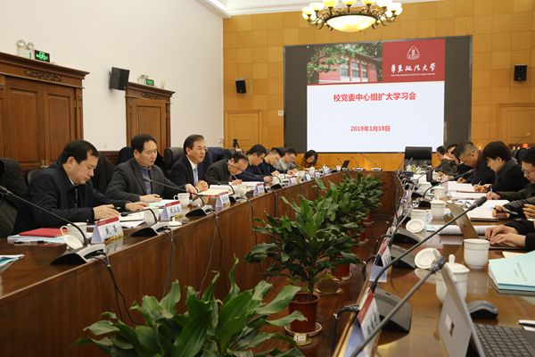 1月18日下午,我校召开党委中心组(扩大)学习会,集中学习传达习近平总书记在庆祝改革开放四十周年大会上的讲话、习近平同志考察上海时的讲话及《关于新形势下党内政治生活的若干准则》等精神。校党委书记郭为禄,党委副书记、校长叶青,党委副书记、副校长闵辉,党委常委、副校长张明军、周立志,党委常委曲玉梁、戴莹、虞潇浩、杨忠孝,党委委员参加会议。会议由郭为禄主持。围绕学习内容,与会人员结合各自的思想、工作实际实际,交流了学习体会。