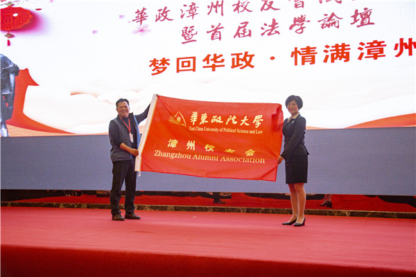 蔡少斌校友代表筹备组介绍了漳州校友会筹备工作情况,大会审议通过《华政漳州校友会章程(草案)》《华政漳州校友会理事会监事会建议名单》,蒋东海、邱志平校友当选为漳州校友会名誉会长,廖惠忠校友当选为会长,蔡少斌校友当选为秘书长。应培礼和蒋东海为漳州校友会揭牌,陈晶莹向漳州校友会廖惠忠会长授旗。