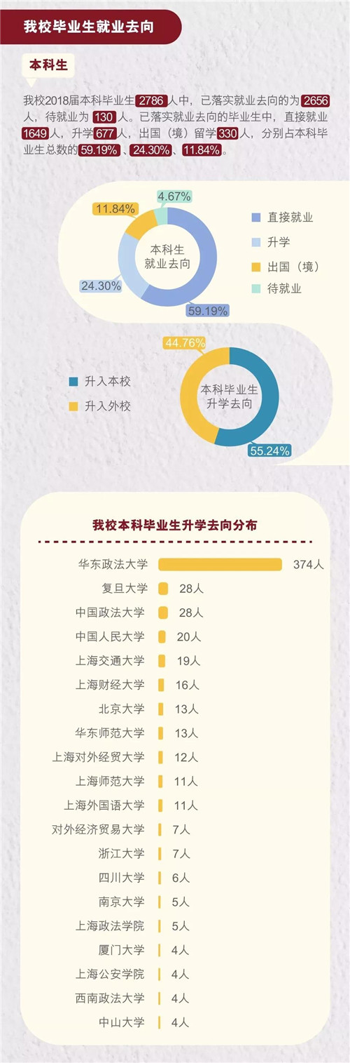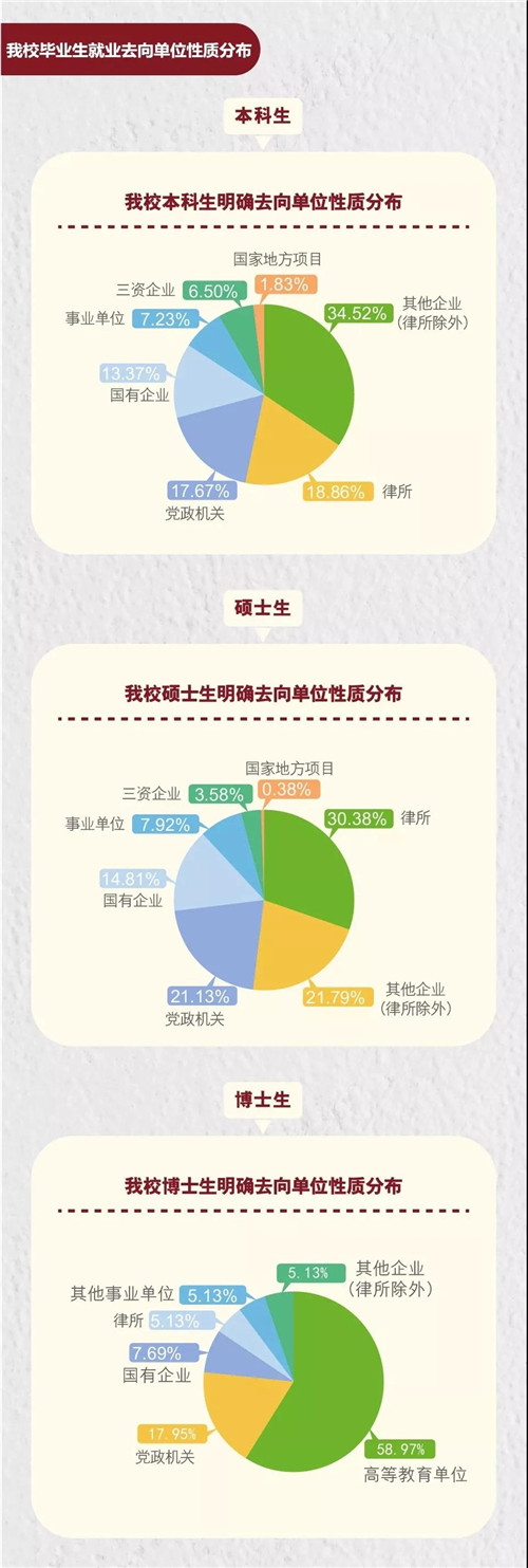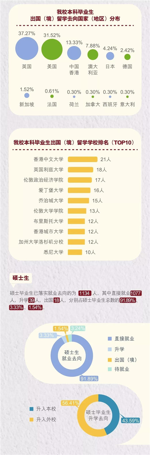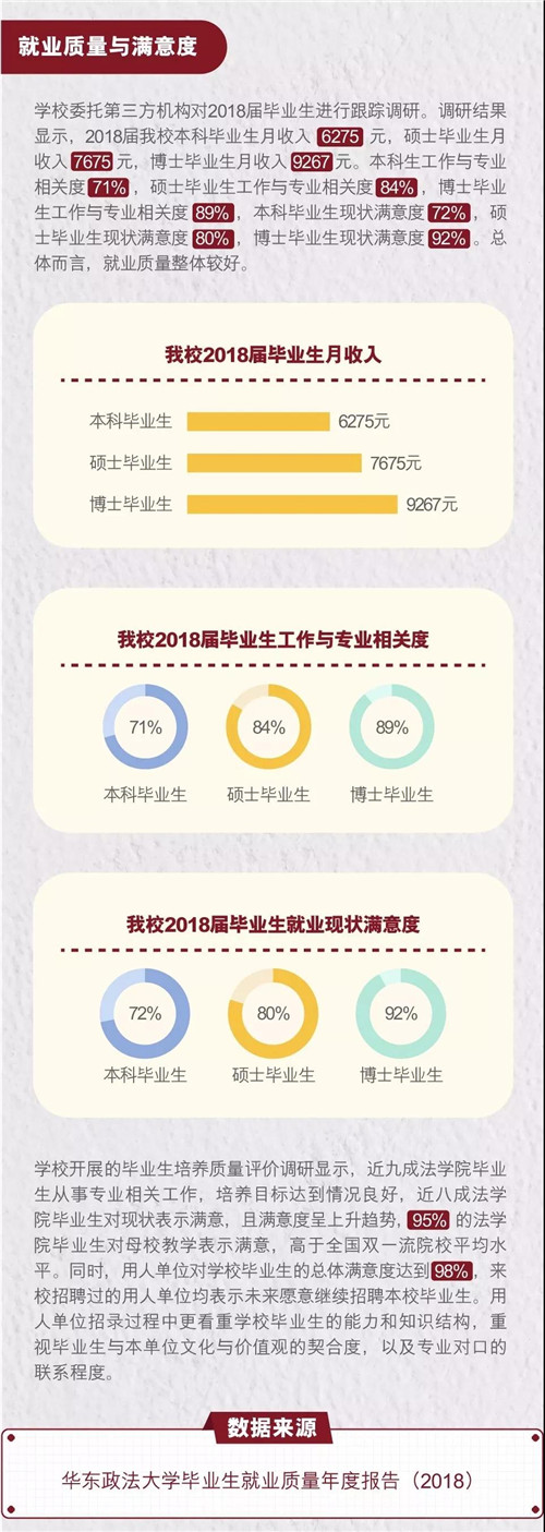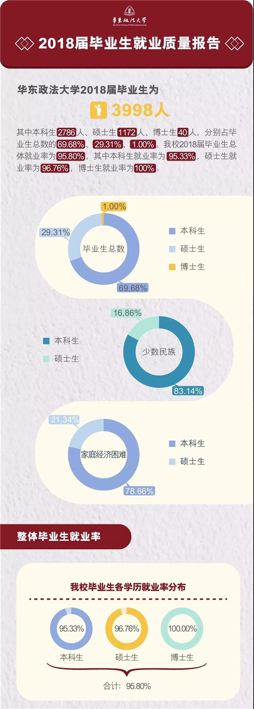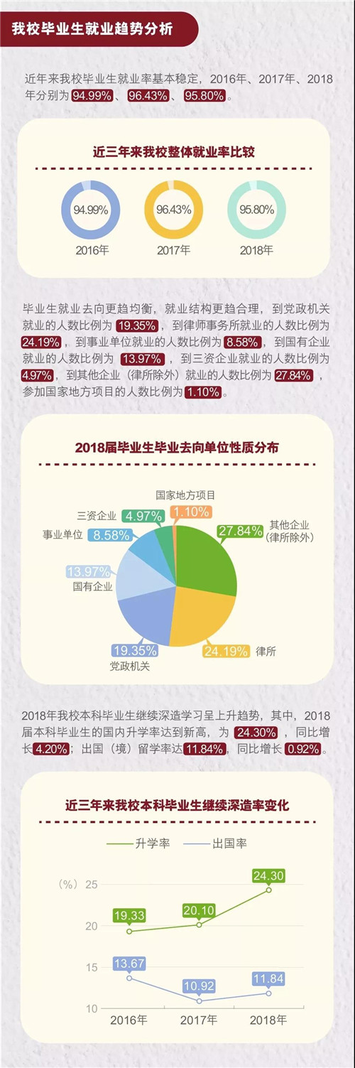 今日,我校正式发布2018届毕业生就业质量报告。2018年,我校共有3998名毕业生,其中本科生2786人、硕士生1172人、博士生40人。总体就业率达95.8%,其中本科生就业率为95.33%,硕士生就业率为96.76%,博士生就业率为100%;超过三分之一的本科毕业生选择再深造,升入学校包括大量“双一流”高校;留学最多的国家(地区)前三名为英国、美国、中国香港;近9成法学院毕业生从事相关工作;近8成法学院毕业生对就业现状表示满意;95%的法学院毕业生对母校教学表示满意,同时用人单位对学校毕业生总体满意度高。