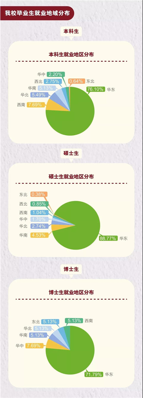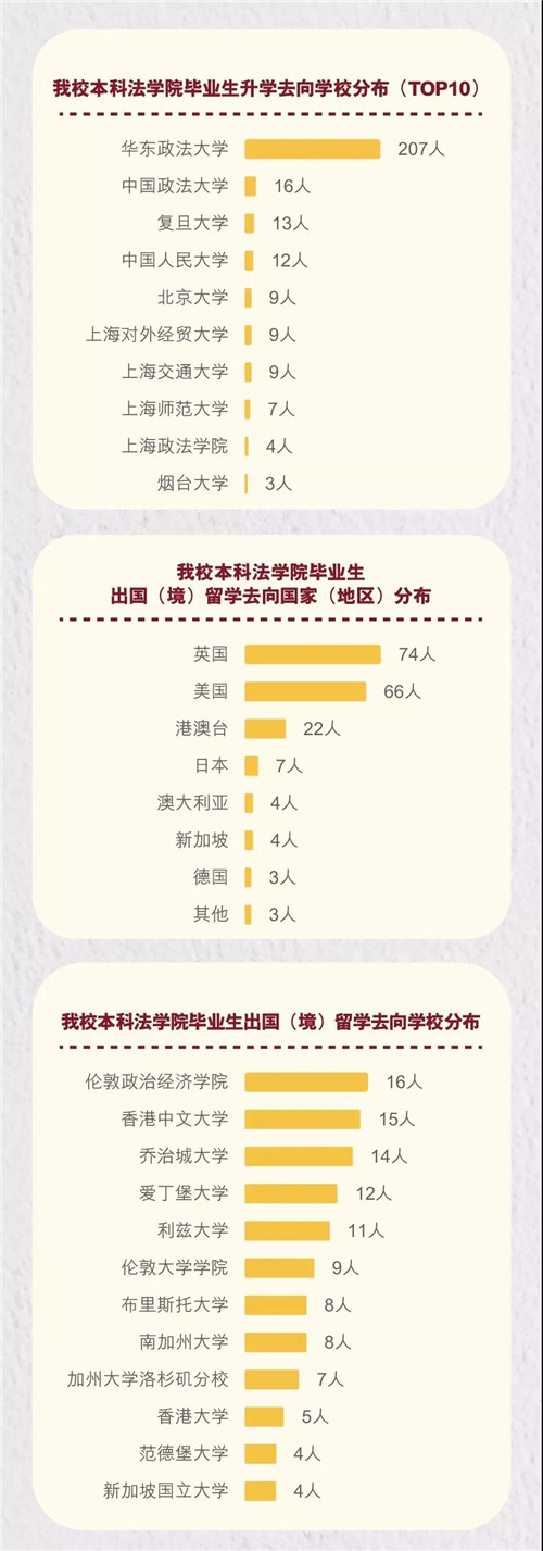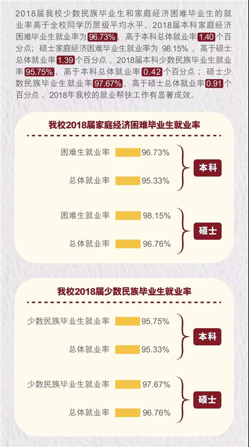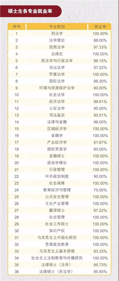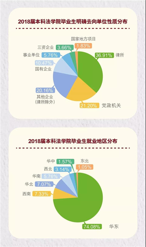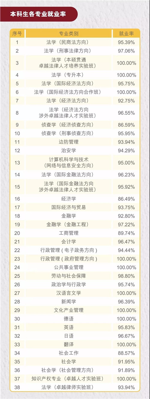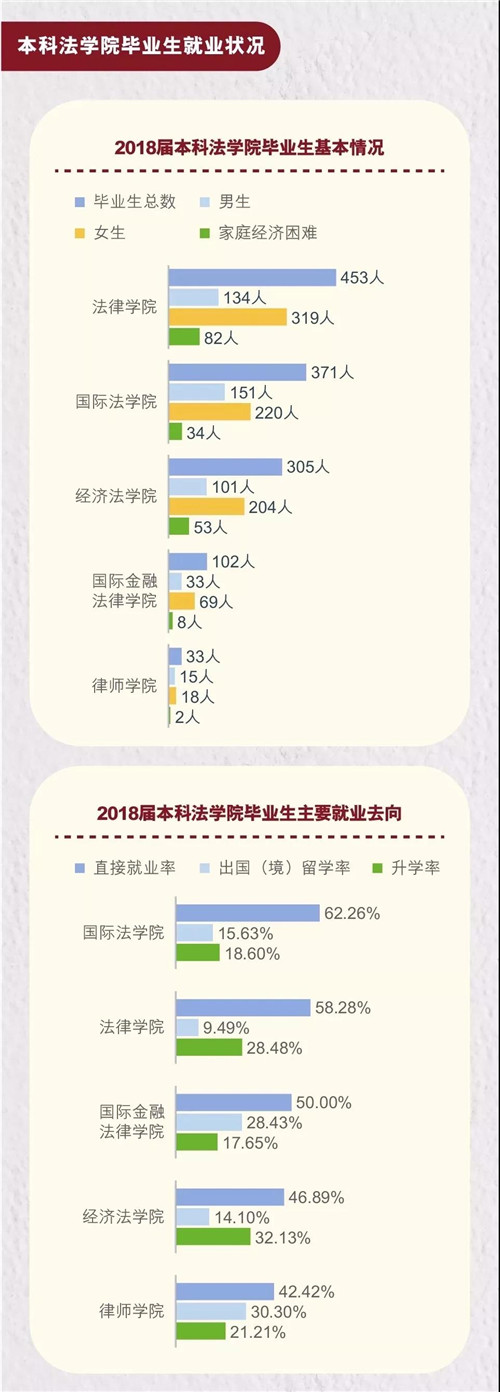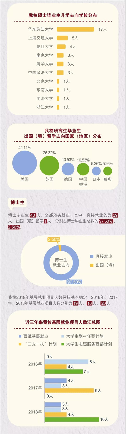 今日,我校正式发布2018届毕业生就业质量报告。2018年,我校共有3998名毕业生,其中本科生2786人、硕士生1172人、博士生40人。总体就业率达95.8%,其中本科生就业率为95.33%,硕士生就业率为96.76%,博士生就业率为100%;超过三分之一的本科毕业生选择再深造,升入学校包括大量“双一流”高校;留学最多的国家(地区)前三名为英国、美国、中国香港;近9成法学院毕业生从事相关工作;近8成法学院毕业生对就业现状表示满意;95%的法学院毕业生对母校教学表示满意,同时用人单位对学校毕业生总体满意度高。